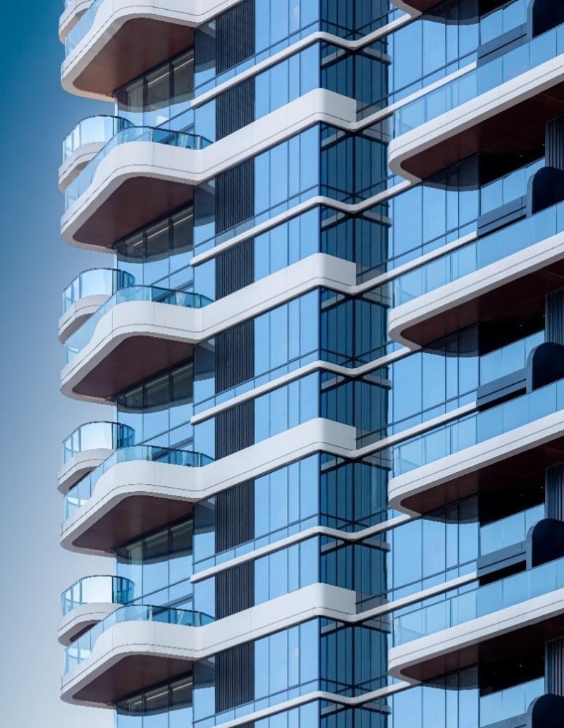 92%玻璃幕+铝板立面设计,蓝钻玻璃、珠光白铝板等高品质材料的运用,使其建筑外立面单方造价成本约等于是普通住宅项目的3倍。这不仅展现了建筑的坚固与美观,更呼应了项目外立面的差异化价值。